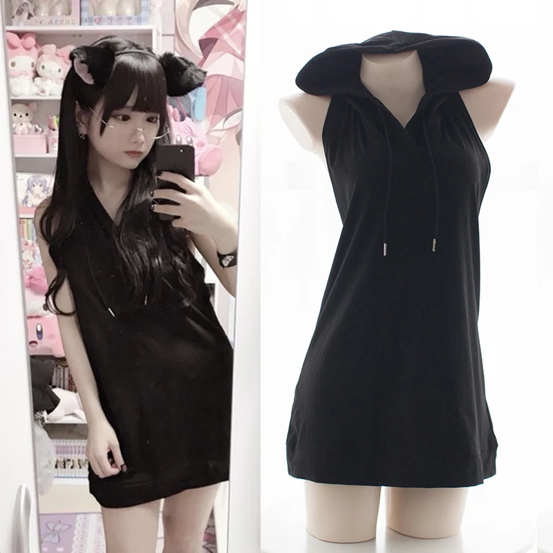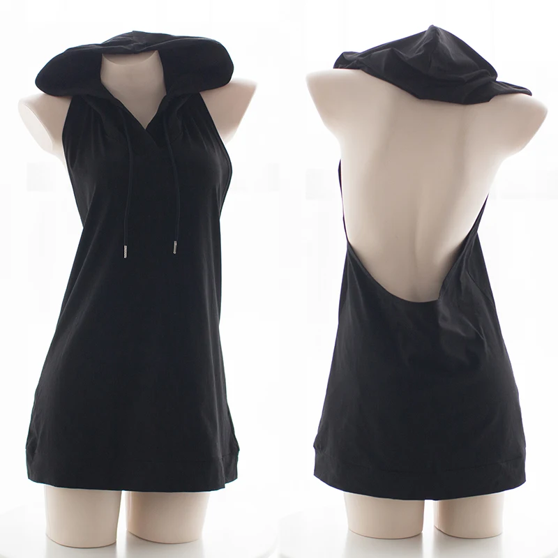 .image of Women's Super Sexy Backless Vest Hooded Black Large Hoodie Hollow Out Jumper Skirt Cosplay Gothic S